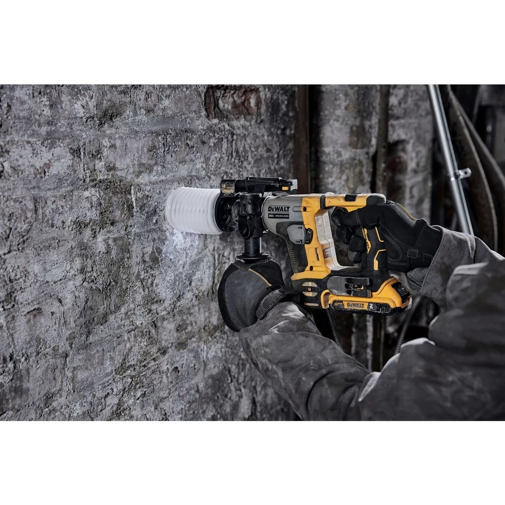 The 20V MAX Brushless 5/8 in. Rotary Hammer is a high performance drill powered by a DEWALT brushless motor and a durable German engineered mechanism, delivering 1.4 Joules of impact energy. The lightweight and compact design makes this tool ideal for rod hanging, concrete forming, cable tray and strut mounting, clip and bracket mounting, and railing mounting. It is part of the PERFORM and PROTECT product line, integrated with the SHOCKS ACTIVE VIBRATION CONTROL System and becomes OSHA Table 1 Compliant when used with the DWH200D shroud and DWH161D1 dust extractor.