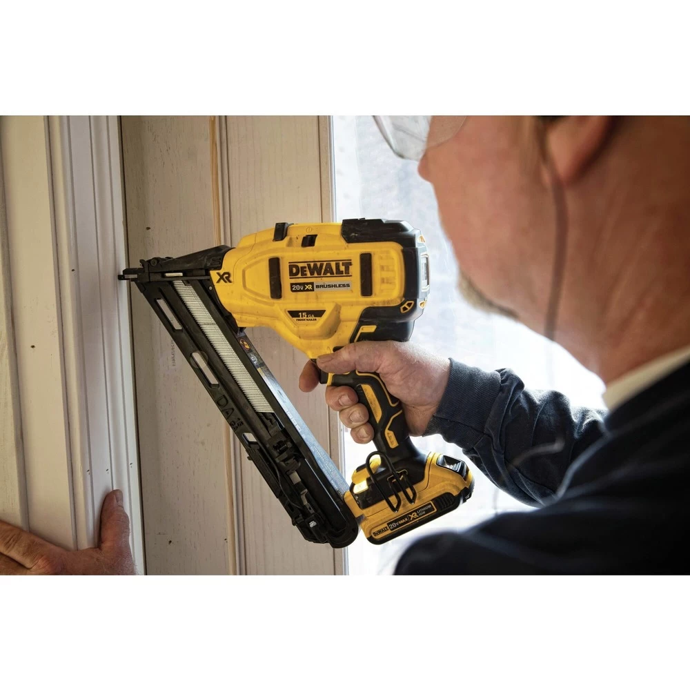 The DEWALT DCN650 15 Gauge Angled Finish Nailer drives 15-gauge angled finish nails from 1-1/4 in. to 2-1/2 in. which makes it ideal for fastening crown molding, casing, baseboards, and hardwood floor installation. With its brushless motor powered by a DEWALT 20V MAX Lithium-Ion battery the DCN650 is ready to go to work without the hassle of using gas, compressor, and hose. Tackle jobs both large and small with the features of a pneumatic tool and the freedom of cordless. Maximum initial battery voltage (measured without a workload) is 20V. Nominal voltage is 18V.