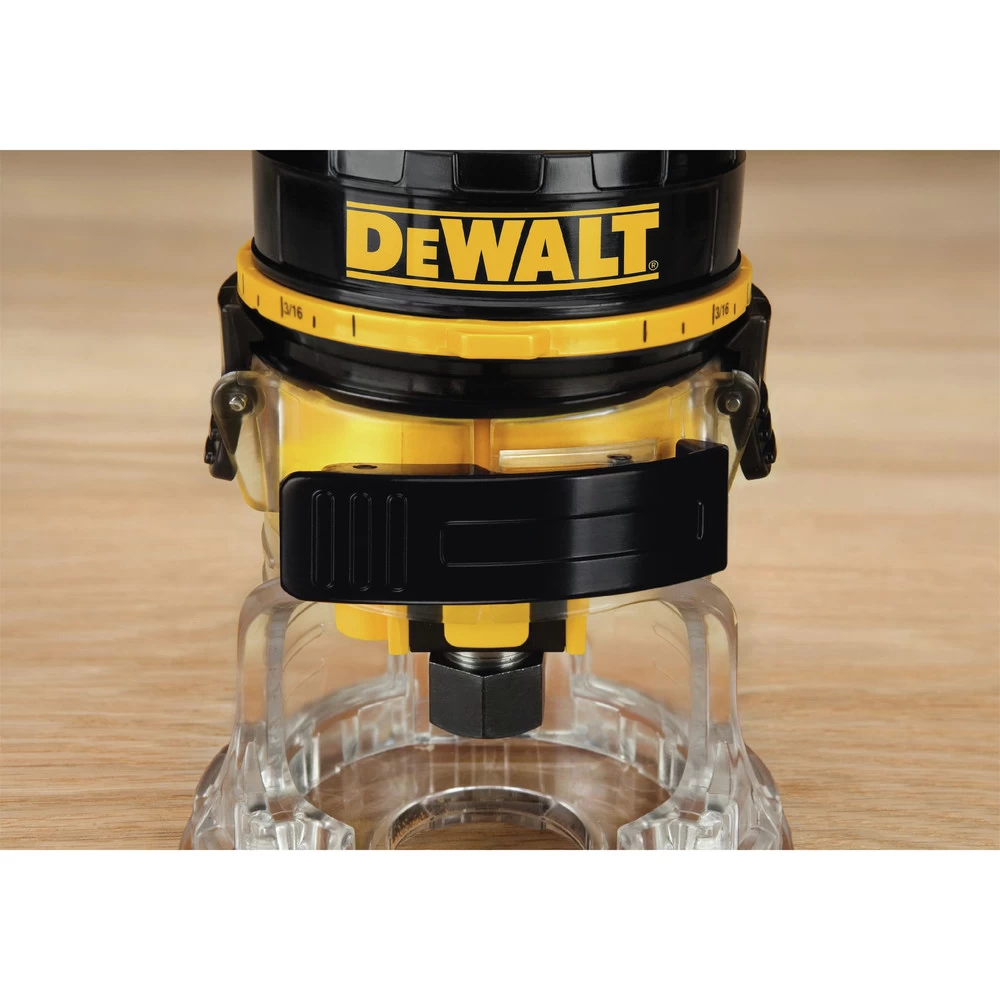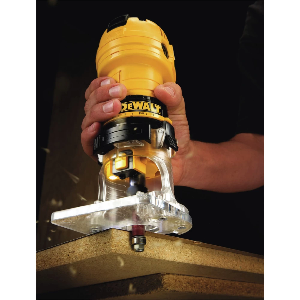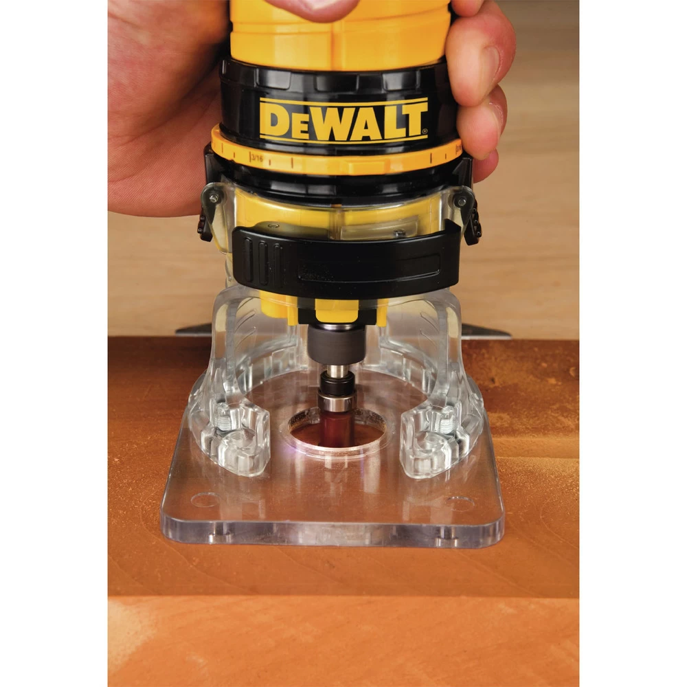 The DEWALT DWE6000 4.5 Amp Single Speed 1/4 in. Laminate Trimmer features and attached depth ring, enabling quick and accurate bit height adjustments along with a spindle lock button allowing for single-wrench bit changes. This laminate trimmer has an onboard LED light and clear sub-base to ensure maximum visibility during operation.