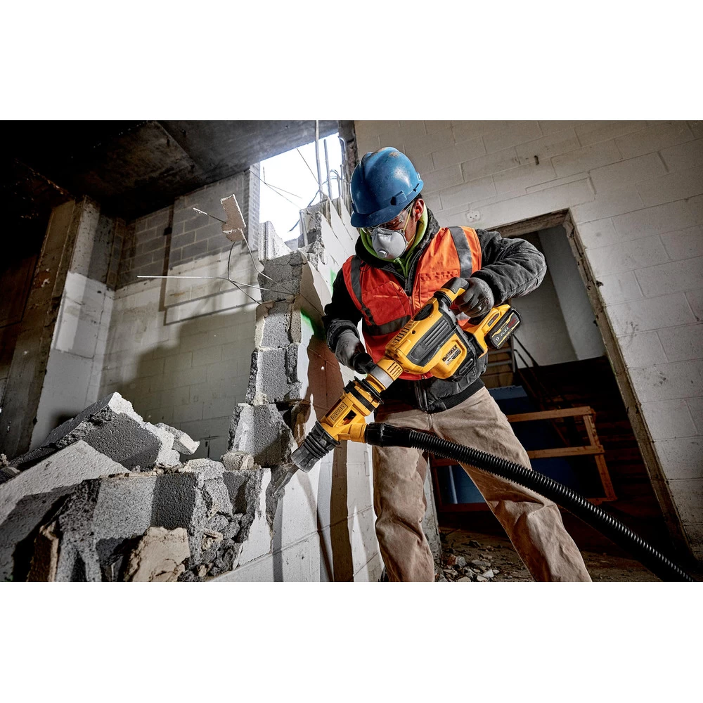 The 60V MAX 1-3/4 in. Brushless SDS MAX Combination Hammer is a midweight, high-performance hammer that is powered by a brushless motor and a durable German engineered mechanism. It delivers 10.5 Joules of impact energy for fast drilling and chipping, even in the hardest concrete. The constant speed electronics allow the tool to maintain speed under load. The midweight design makes it ideally suited for horizontal drilling for #4 – #8 rebar dowel applications, dry coring up to 4 in., chipping in any mid to upper wall, and ground rod driving. This hammer is part of the PERFORM AND PROTECT product line, integrated with the Anti-Rotation E-CLUTCH System and the SHOCKS Active Vibration Control System. E-CLUTCH shuts down the tool in bind up situations. SHOCKS reduces vibration felt by the user at the handles, compared to rotary hammers without this feature. The DCH614 is equipped with WIRELESS TOOL CONTROL, which allows the user to link the tool to the DCV585 60V MAX dust extractor for remote extractor activation. This tool comes Tag Ready so users and companies can attach the DEWALT Tag and track its location virtually anywhere via the DEWALT Tool Connect app.