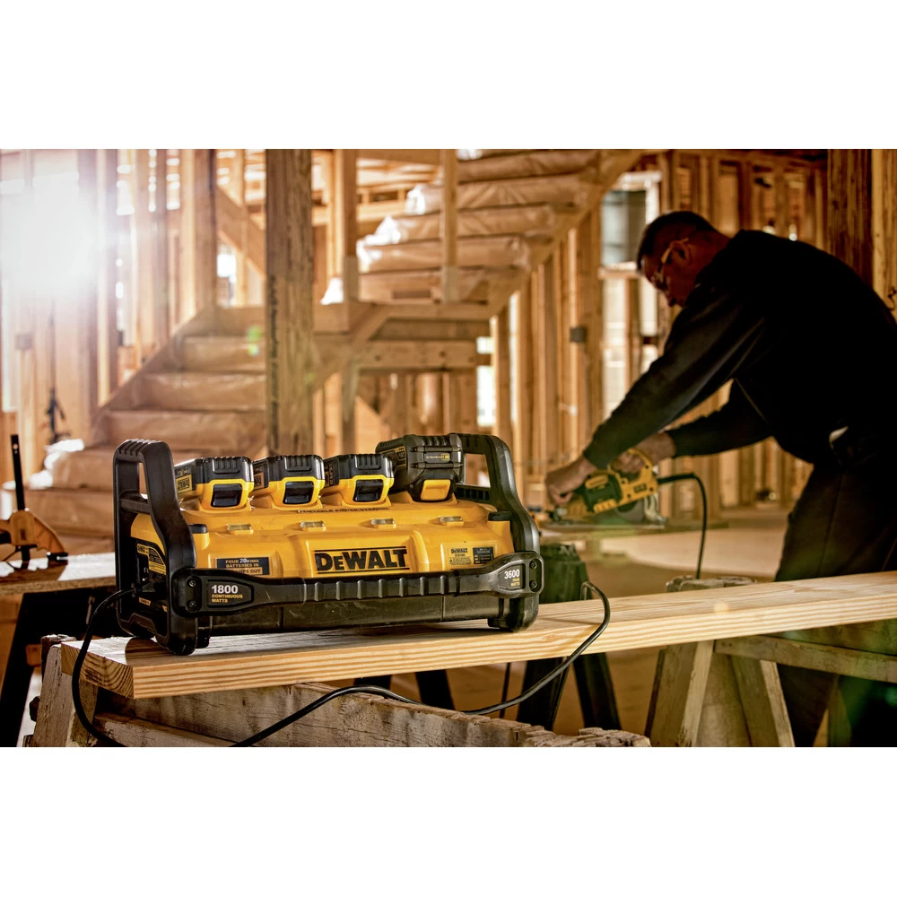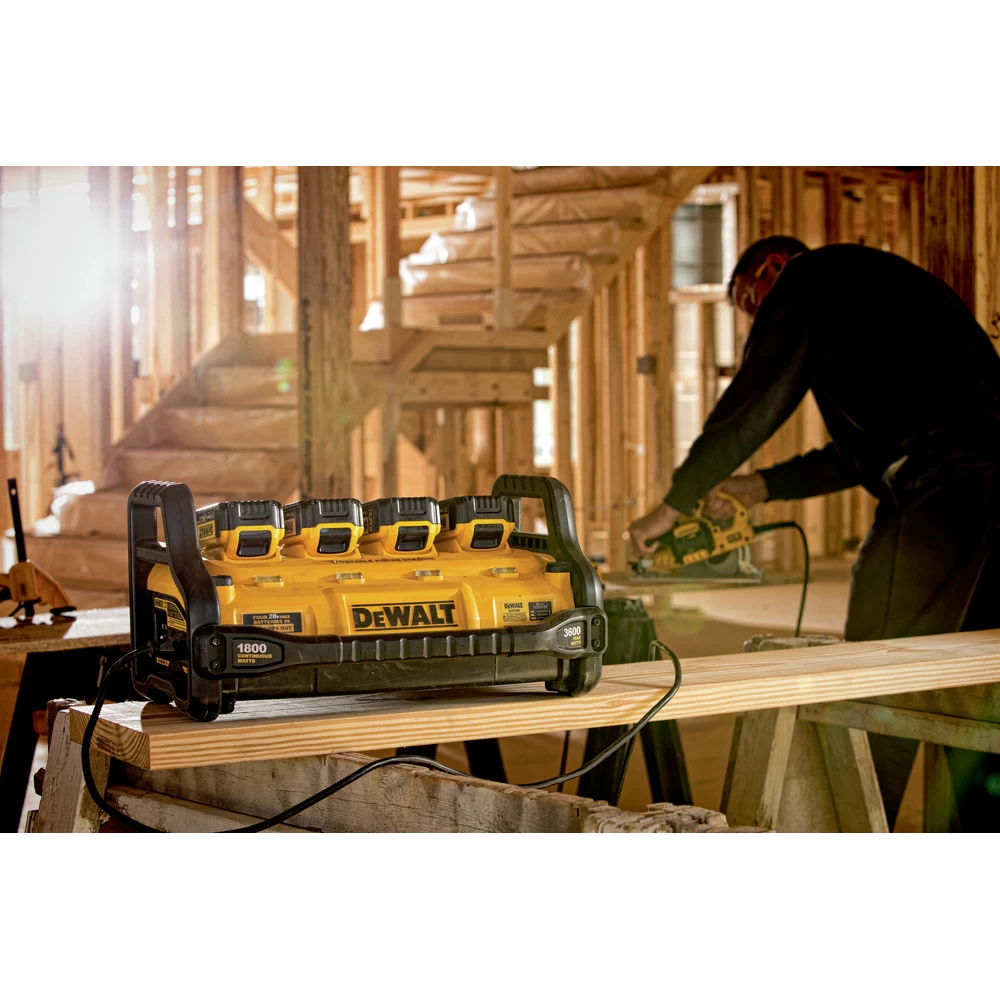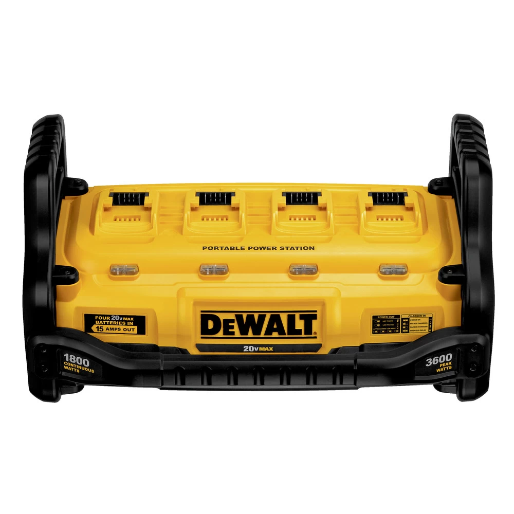 The 1800 Watt Portable Power Station and Simultaneous Battery Charger allows for AC power in remote locations for convenient portable power. Able to run most corded tools, it provides 1800 Watts (15 Amp) continuous power and 3600 Watts peak power. The DCB1800B runs on four DEWALT 20V MAX batteries (including FLEXVOLT), and for high power applications, (4) 20V MAX 3 Ah DEWALT Batteries (DCB200) or higher amp hour are recommended to provide the best results. Not only can the 1800 Watt Portable Power Station power a corded tool remotely, but it also becomes a multi-port simultaneous charger for up to (4) DEWALT 20V MAX Batteries (including FLEXVOLT) when plugged into a wall outlet via extension cord (batteries and extension cord sold separately). Compact and lightweight, the 1800 Watt Portable Power Station weighs just 18 lbs. (without batteries) and is easily portable. Without the need for gas to run, there are no fumes or carbon monoxide emitted from the device. In addition, the 1800 Watt Portable Power Station can be used to provide temporary power in areas where noise is restricted such as a jobsite with strict regulations. With an integrated temperature-controlled cooling fan and heavy-duty roll cage, the Portable Power Station is a durable and convenient power solution for a variety of uses.