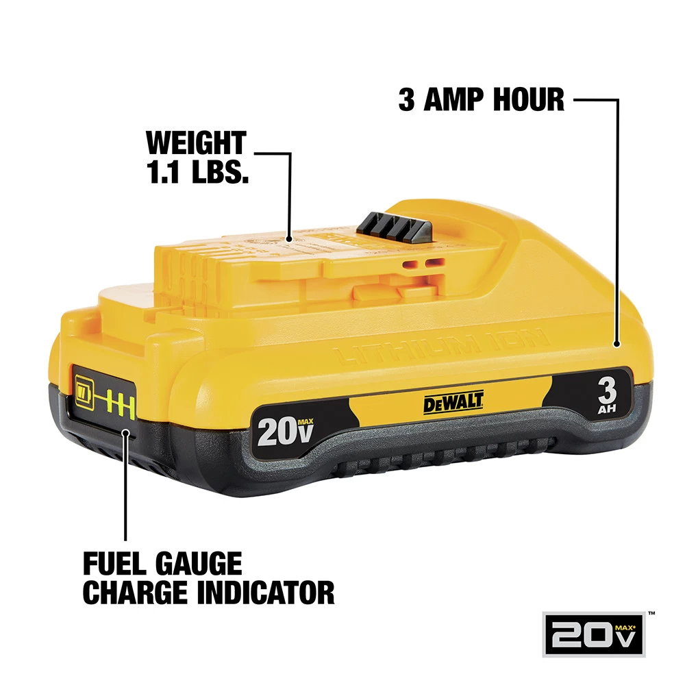 This 20V MAX 3 Ah Battery 2-Pack gives you a pair of our highest-capacity batteries in the 20V MAX compact series. They provide 3 Ah capacity with reduced weight, giving you ergonomic benefits for extended power tool use. It includes a 3-LED Fuel Gauge system to instantly check battery state of charge. This battery is compatible with all DEWALT 20V MAX power tools and includes 3-Year Limited Warranty.