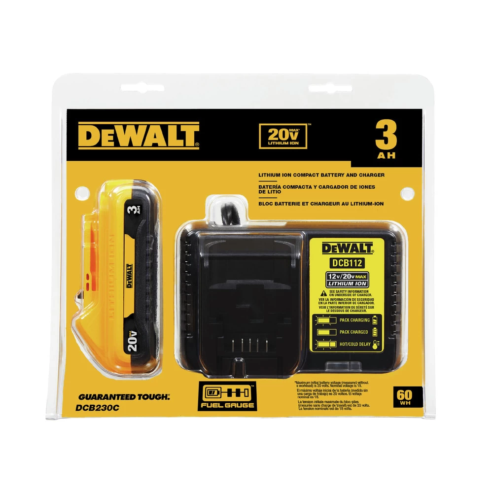 The 20V MAX Starter Kit includes our 3 Ah Compact Battery and Charger. Using the latest in lithium ion technology, this battery provides 3 Ah capacity in a compact form, offering ergonomic benefits for extended power tool use. The 3-LED Fuel Gauge system on the battery allows you to instantly check battery state of charge. The included charger features quick charging with a multi-function LED indicator to display charging status, when to replace battery pack, and battery temperature. The included battery is compatible with all DEWALT 20V MAX power tools and includes 3-Year Limited Warranty.