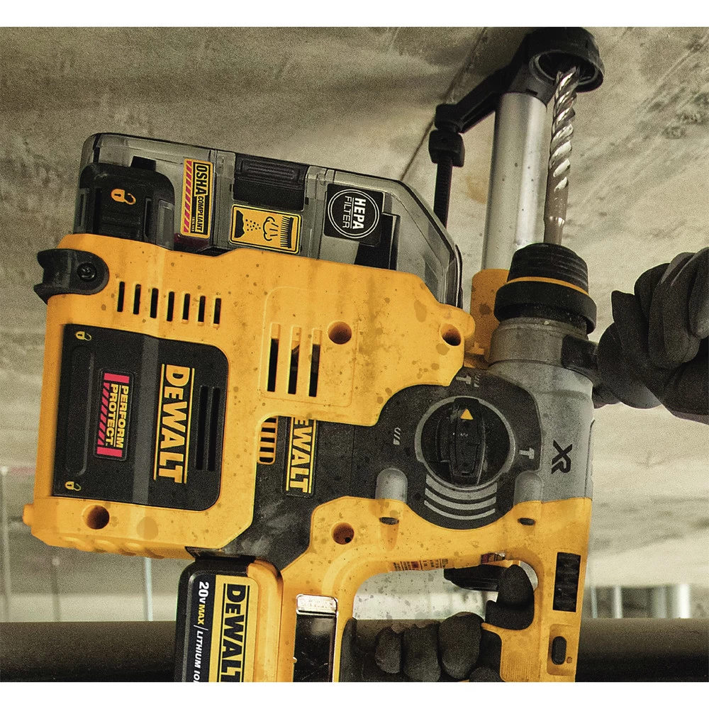 This OSHA Table 1-compliant Dust Extractor works with the DCH273 1 in. Hammer. It features an OSHA 1926.1153-compliant Dust Box Assembly. With a filter cleaning mechanism and a HEPA filter, it removes 99.97% of airborne particles 0.3 microns or greater. The Dust Extractor has a powerful built in motor for increased suction during high performance drilling. The 2-second power-off delay ensures that dust extraction continues after the drill is switched off. It accomodates drill bit diameters up to 5/8 in. which allows users to drill overhead for 1/2 in. drop-ins.
